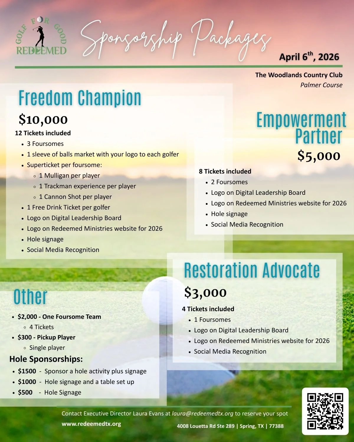The sponsorships are listed below. Please consider supporting Redeemed and the Sparrows by sponsoring this Golf for Good 2025 event.